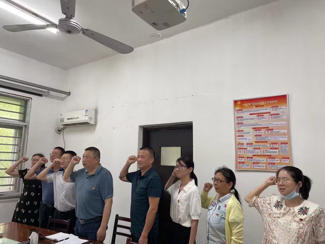 首先,全体党员重温入党誓词,交纳6月党费,之后集体诵读《中国共产党章程》第六章。